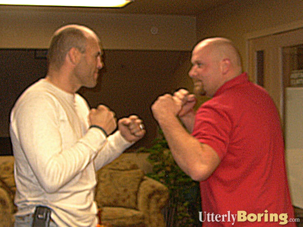 Speaking of people that could kick your butt, this last weekend MMA stud Randy Couture stayed in one of our homes. He was staying as a guest of the owner of this particular house, so nobody really knew he was coming until he came in to pay for the reservation. Again, I wasn’t frickin’ here. The front desk managed to get a couple pictures with our crappy camera (our good digital camera was in use) so these are out of focus and blurry — I sharpened them in Photoshop the best I could. The one of the left is our carpet cleaning guy (and big MMA/UFC fan) doing the ready to rumble pose with Randy and the one on the left is Randy with our front desk manager: